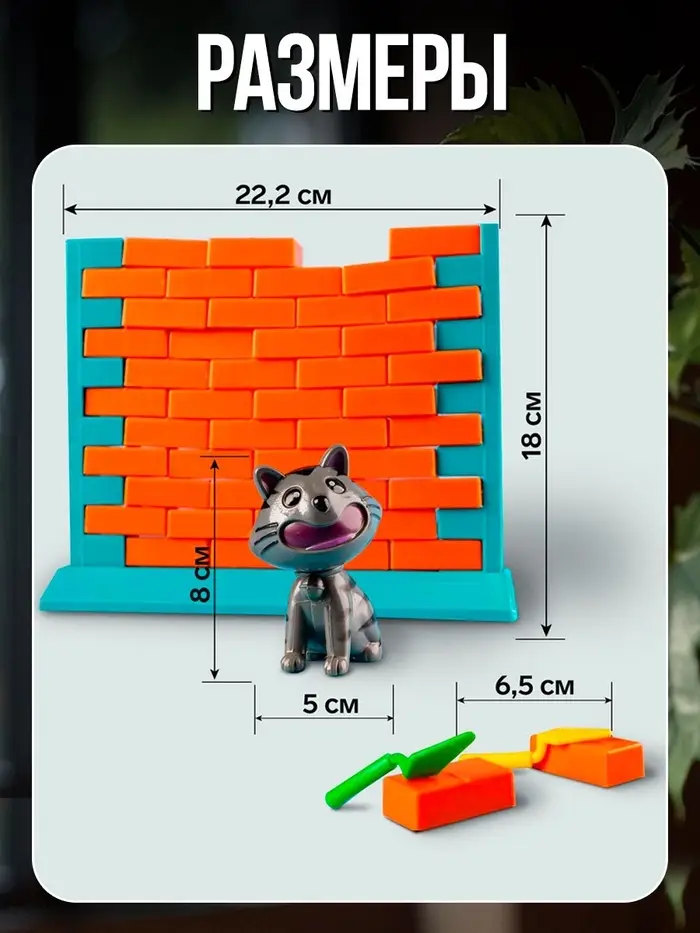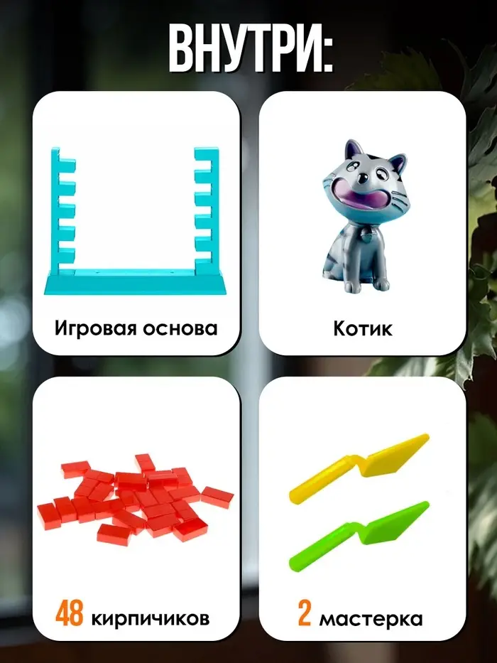 С настольной игрой «Спаси кота» ребёнок прокачает логическое мышление, мелкую моторику и координацию движений. Ведь вынуть кирпичики и не уронить при этом котика не так просто! Нужно тщательно продумывать каждое действие и аккуратно орудовать мастерком!