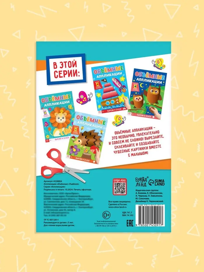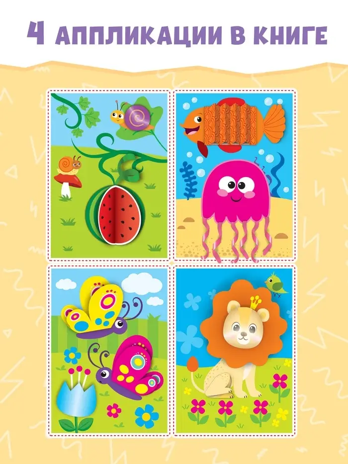 Аппликации объёмные «Львёнок» — 20 страниц удовольствия для вашего ребёнка и 4 поделки, собранные своими руками. Здесь он познакомится с рыбкой и осьминожкой, весёлыми зверушками и птичками, спелыми фруктами и ягодами.