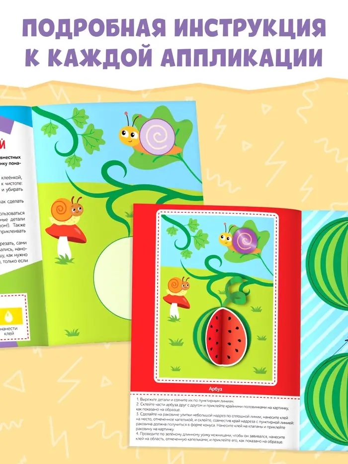 На каждой странице подробно описаны правила создания аппликации. Для работы малышу потребуются ножницы, клей и ваша помощь. Для удобства в книге есть условные обозначения необходимых действий: вырезать, согнуть, завить ножницами, нанести клей.
