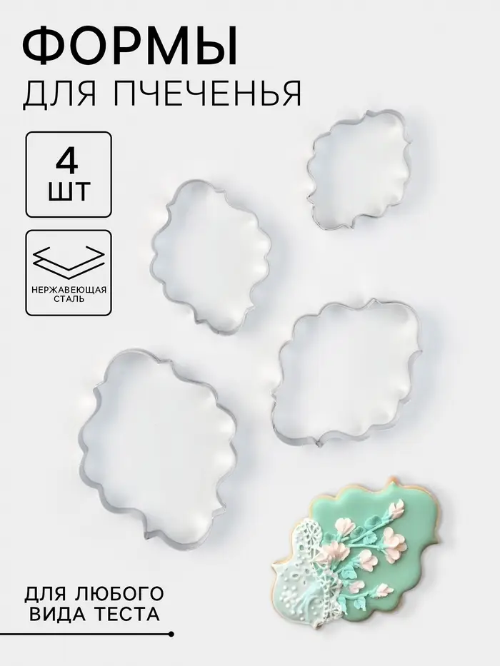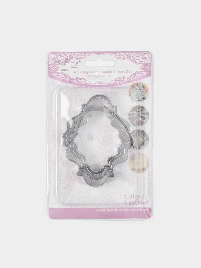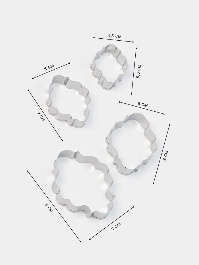 Набор форм «Рамка для фото» — стильный инструмент для тех, кто хочет превратить печенье в персональное послание. Четыре металлические вырубки создают аккуратные рамки разного размера — идеально для композиций с именами, датами или мини-«фото» из глазури. Серебристая нержавеющая сталь обеспечивает чёткий рез и долговечность.