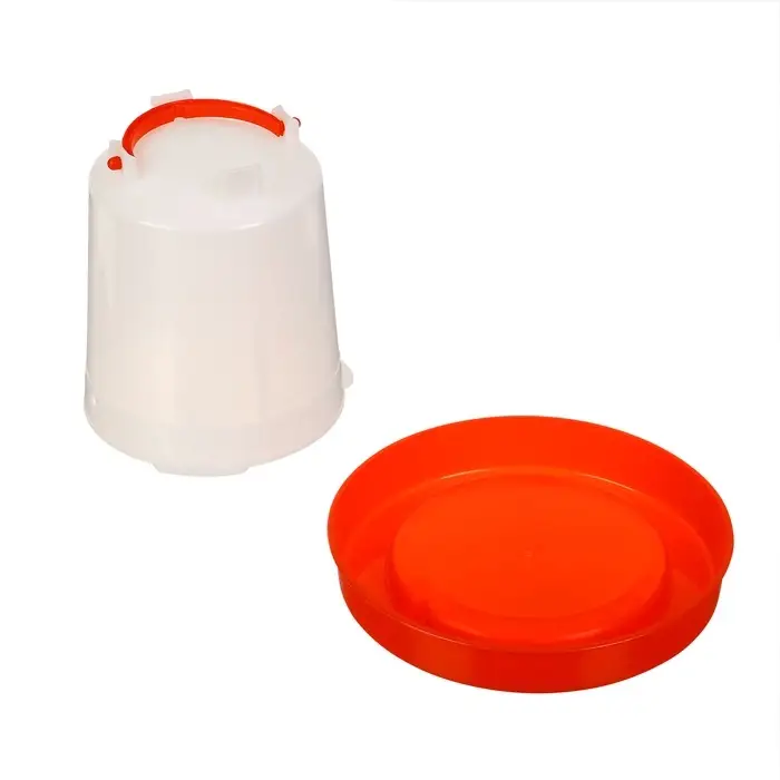 Вакуумная поилка пригодится для поения птицы. Состоит из бачка-конуса и крышки-дна.