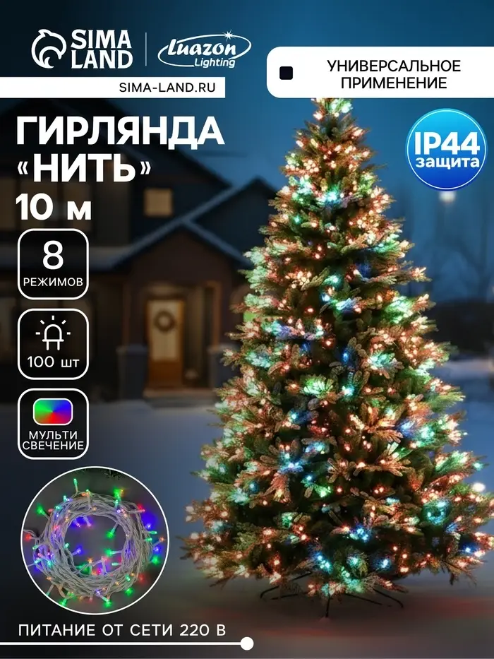 Гирлянда «Нить» 10 м, IP44, белая нить, 100 LED, свечение мульти, 8 режимов, 220 В
