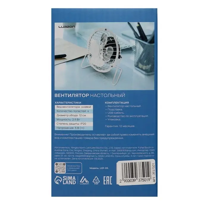 Вентилятор настольный Luazon LOF-06, осевой, 2.5 Вт, 12 см, пластик, белый