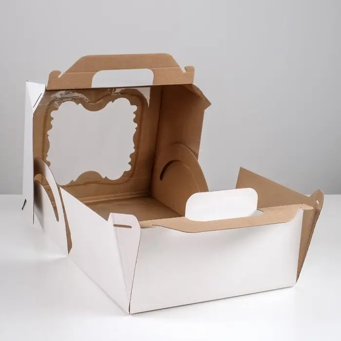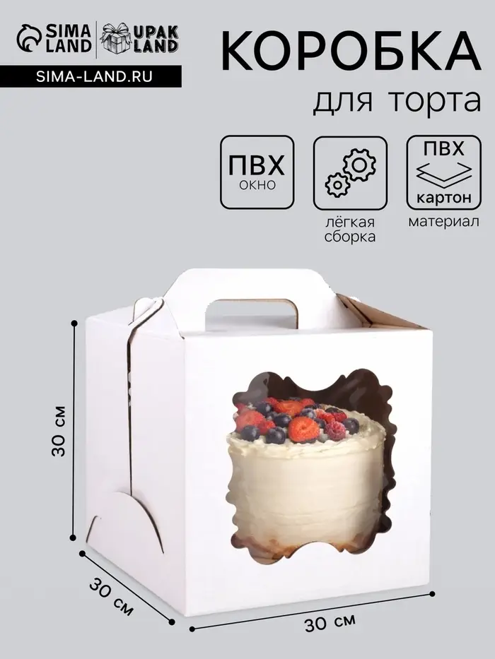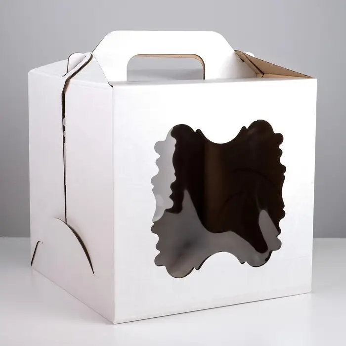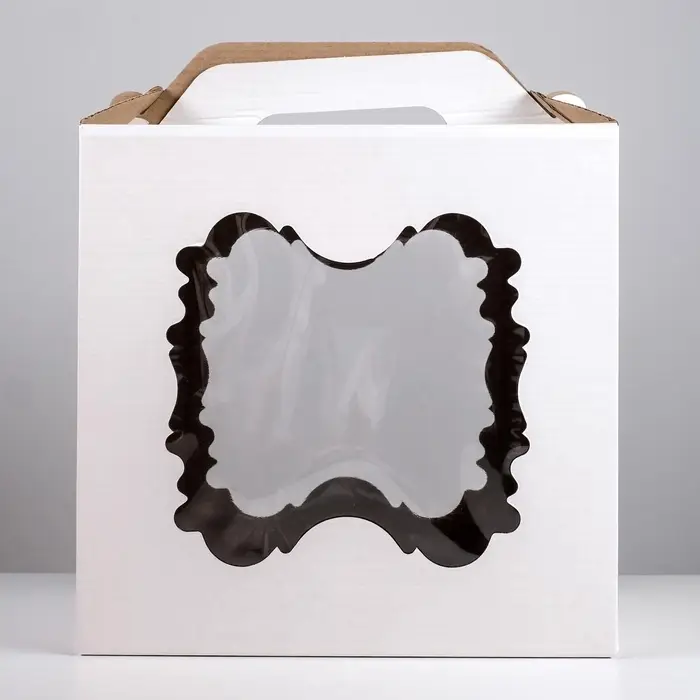 Усиленная коробка для высоких и тяжёлых тортов. Белая коробка для торта с двумя окнами и ручкой, 30×30×30 см — это профессиональное решение для безопасной транспортировки крупных и многоярусных десертов. Её кубическая форма, высота 30 см и усиленная ручка рассчитаны на солидную нагрузку.