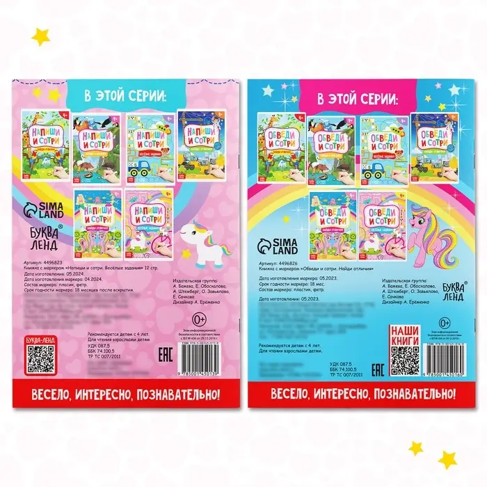 В каждой книге 12 страниц. Они выполнены из бумаги, а маркер — из пластика. Издание рекомендовано детям старше 4 лет.