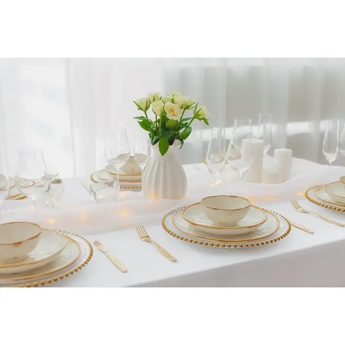 Оригинальная коллекция посуды Organic Gold от торговой марки Доляна не оставит никого равнодушным! Вся серия изготовлена из прочного фарфора и обладает неповторимым дизайном: рельефная «мятая» текстура и эффект золотой насыпи. Несмотря на свой изящный внешний вид, посуда рассчитана на ежедневное использование.