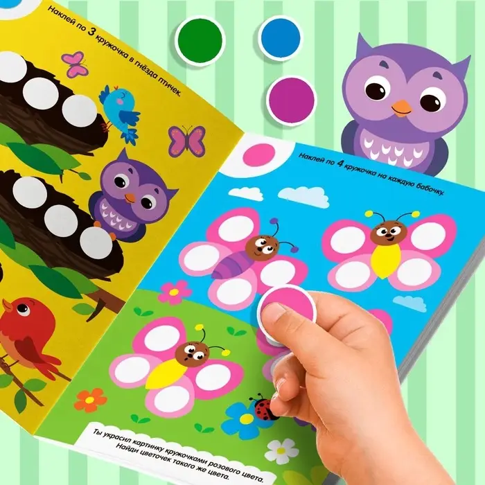 - Красочные картинки и милые персонажи подсказывают, куда именно нужно прикрепить наклейку-кружочек.