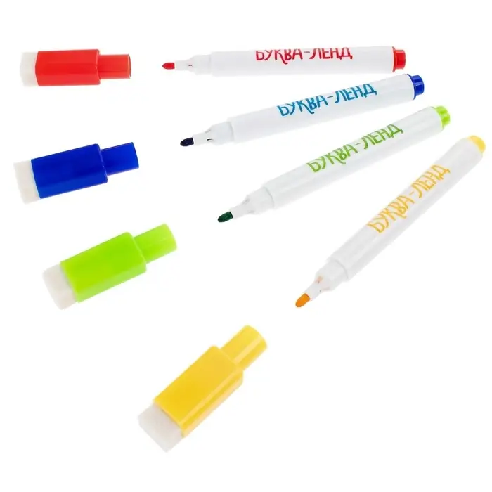 - В комплекте 4 маркера на водной основе с удобными стирателями на колпачках.