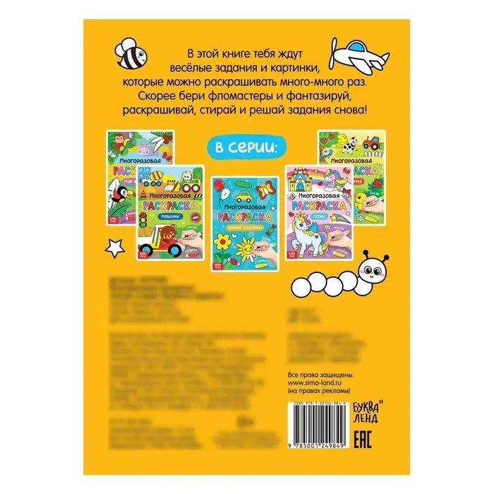- 12 многоразовых страниц, которые можно раскрашивать, стирать и создавать новые рисунки без ограничений.