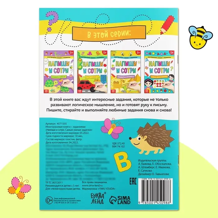 Книга многоразовая с заданиями «Напиши и сотри. Самые умные задачки», 12 стр., маркер