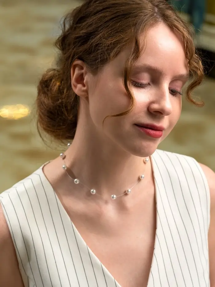 - Элегантный дизайн: белые бусины в сочетании с серебристыми элементами придают образу роскошь и свежесть.