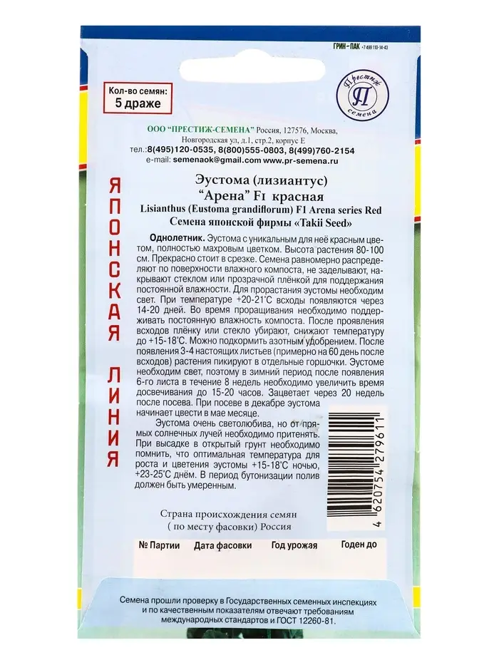 Семена цветов Эустома "Арена" красный F1, 5 др