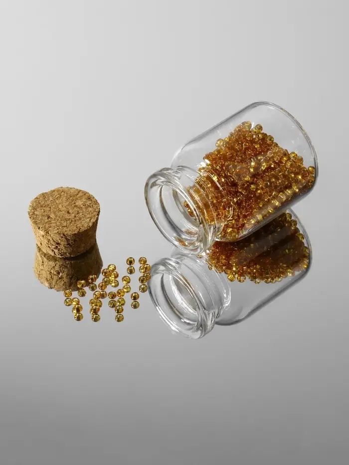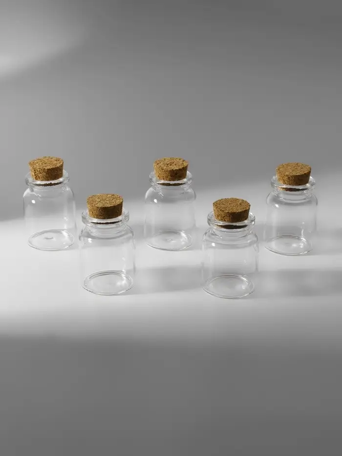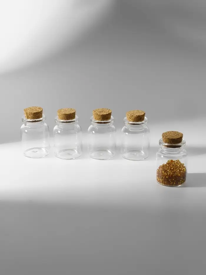 Каждая баночка имеет размеры 3×4.5 см, что делает их компактными и удобными для хранения. Прозрачный стеклянный корпус позволяет легко видеть содержимое, а пробковая крышка надежно защищает ваши материалы от пыли и повреждений.