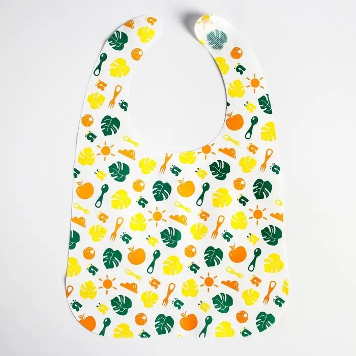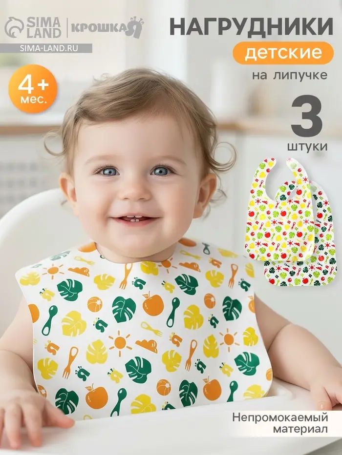 Товар изготовлен из материалов, не содержащего токсичных веществ. После использования мойте тёплой мыльной водой. Нагрудник рекомендован для детей старше 4 месяцев. В наборе 3 нагрудника с разным рисунком.