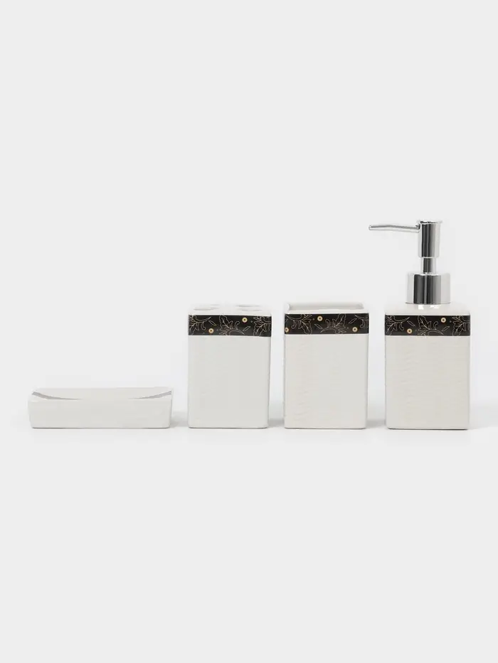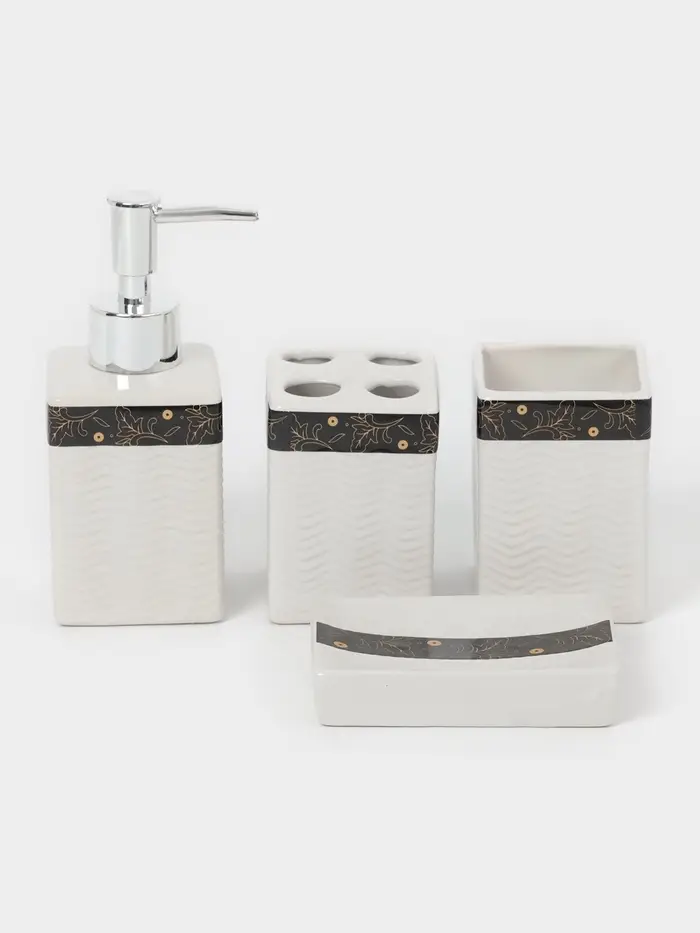 Набор аксессуаров организует пространство и станет стильным украшением Вашей ванной комнаты. За счет сдержанного дизайна данный керамический набор в ванную подойдет к любому дизайну ванной комнаты. Набор состоит из 4 предметов: 2 стакана, мыльница, дозатор.