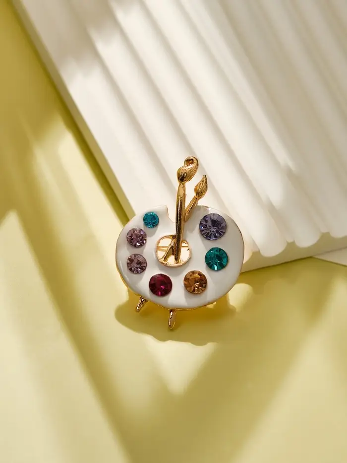 Погрузитесь в мир творчества и вдохновения с этой яркой брошей в форме палитры красок. С длиной 4,7 см, она выполнена из качественного металла с золотым покрытием и украшена многоцветными вставками из эмали и страз, что делает её настоящим произведением искусства.