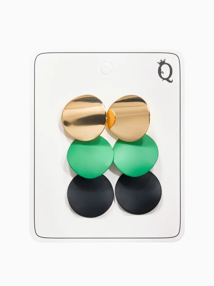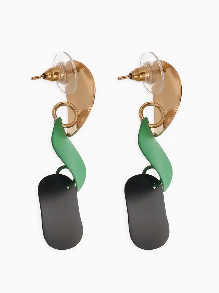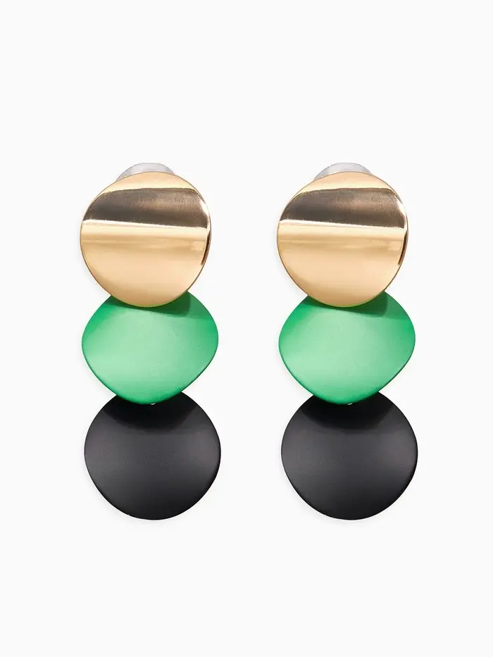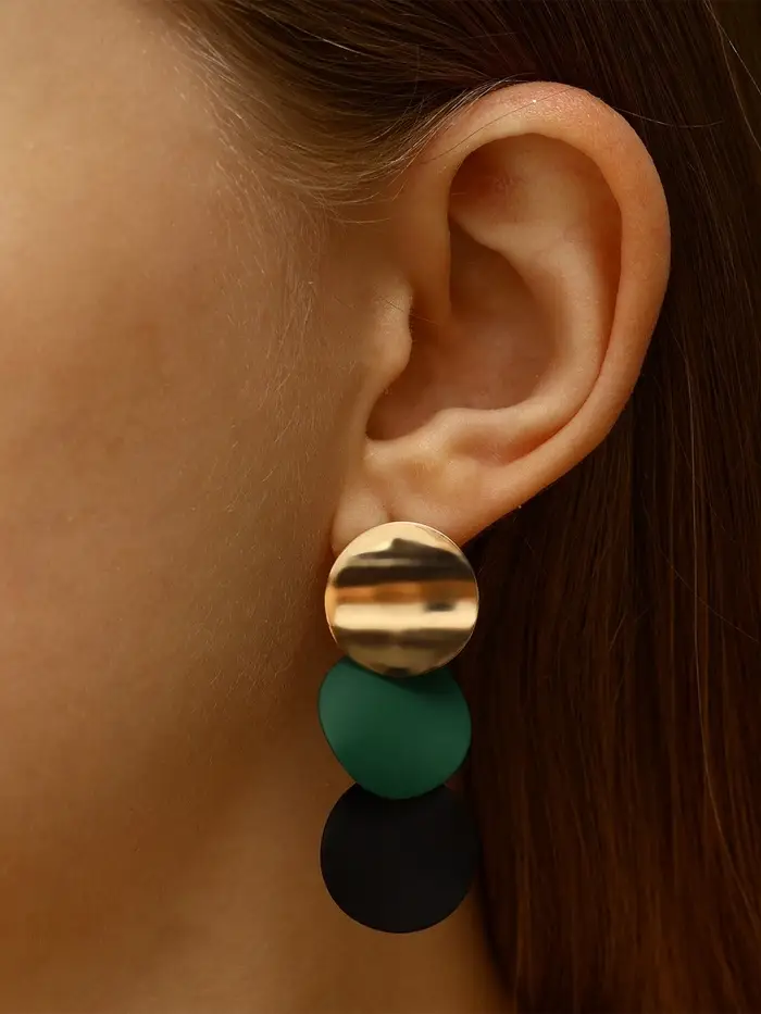 Серьги с выгнутыми круглыми элементами в чёрно-зелёных тонах на золотистой основе — современный аксессуар для женщин, ценящих необычные формы и гармоничное сочетание цветов. Размер 4,6 см делает украшение заметным, но удобным для ежедневного ношения и праздничных образов.