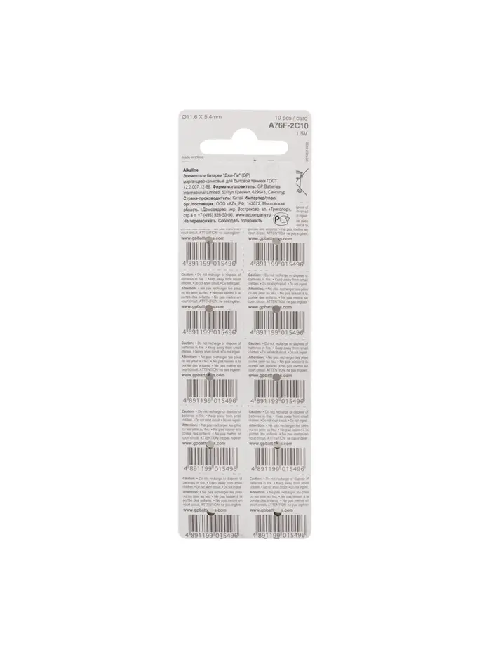 GP A76-BC10 – элемент питания щелочного типа. Плоская форма и компактные размеры позволяют использовать данный тип как универсальный для портативных устройств: электронных часов, калькуляторов, слуховых аппаратов, детских игрушек. В батарейке используется марганцево-цинковый электролит, благодаря чему при низком внутреннем сопротивлении и стабильном малом разряде срок хранения элементов питания увеличивается до 3 лет. Комплект состоит из десяти батареек, что позволит обеспечить энергией сразу несколько устройств.