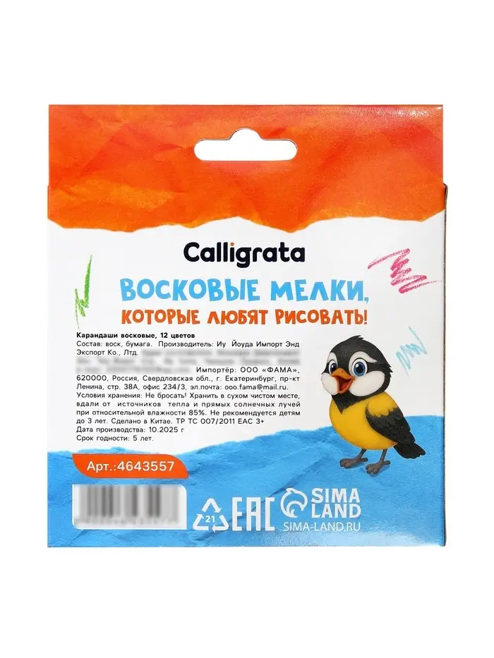 - Каждый карандаш завернут в бумажную этикетку, что предохраняет от загрязнений, снижает скольжение, увеличивает прочность. Восковые карандаши упакованы в картонную коробку с европодвесом.