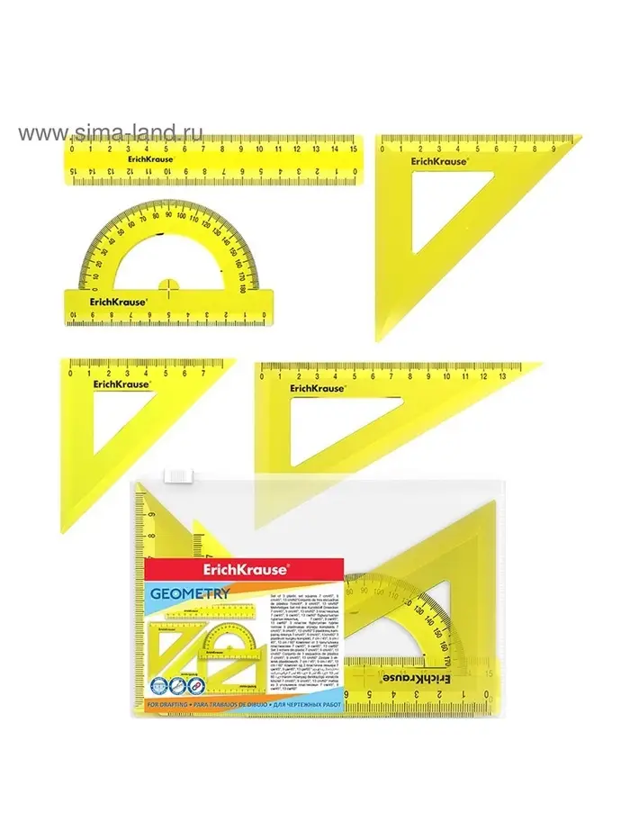 - В набор входит прямая линейка длиной 15 см, угольник с прямым углом (90°) и полукруглый транспортир для измерения углов от 0 до 180 градусов.