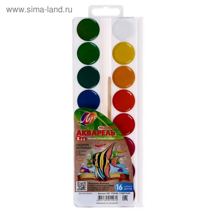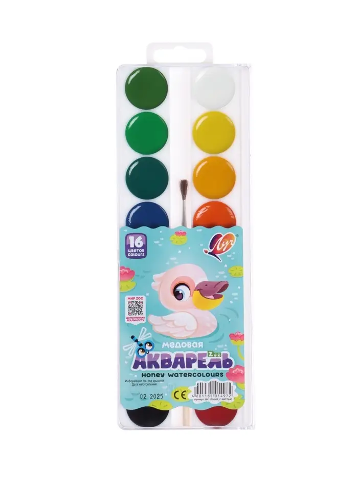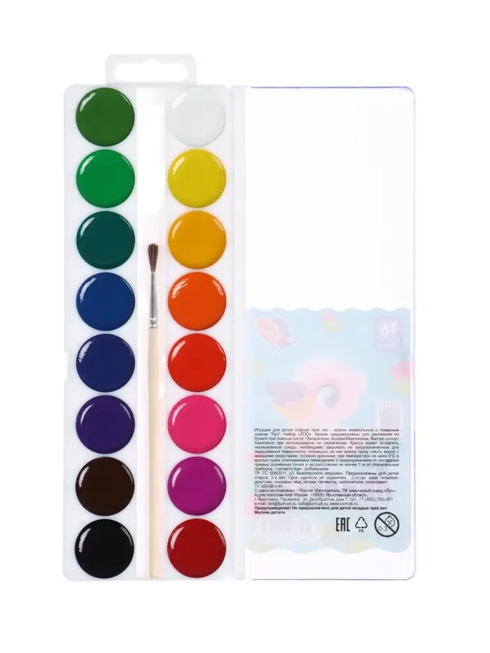 Акварель «Луч. ZOO», 16 цветов, с кистью