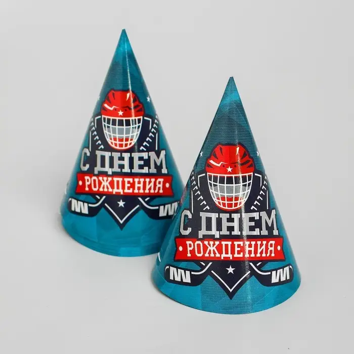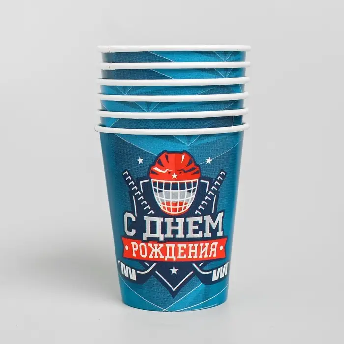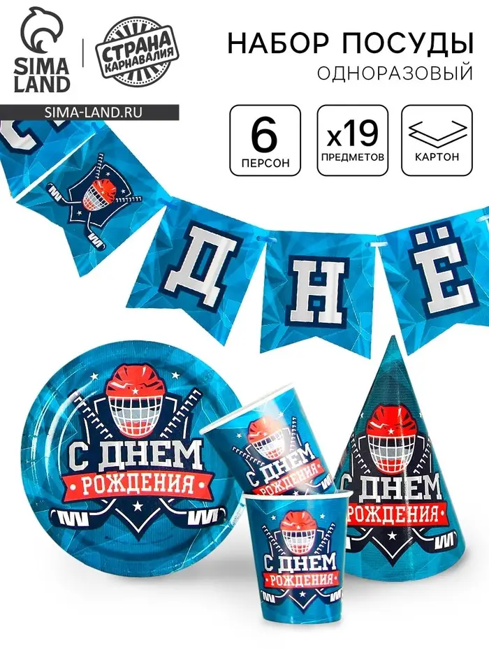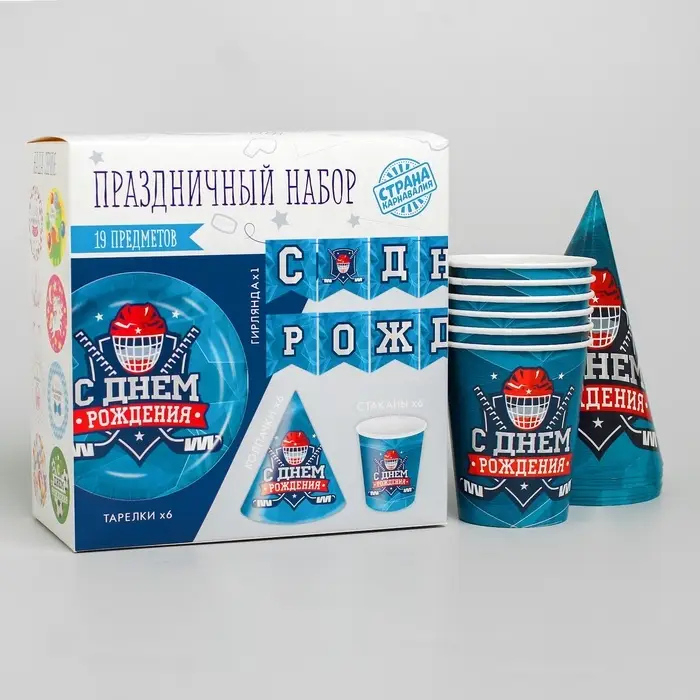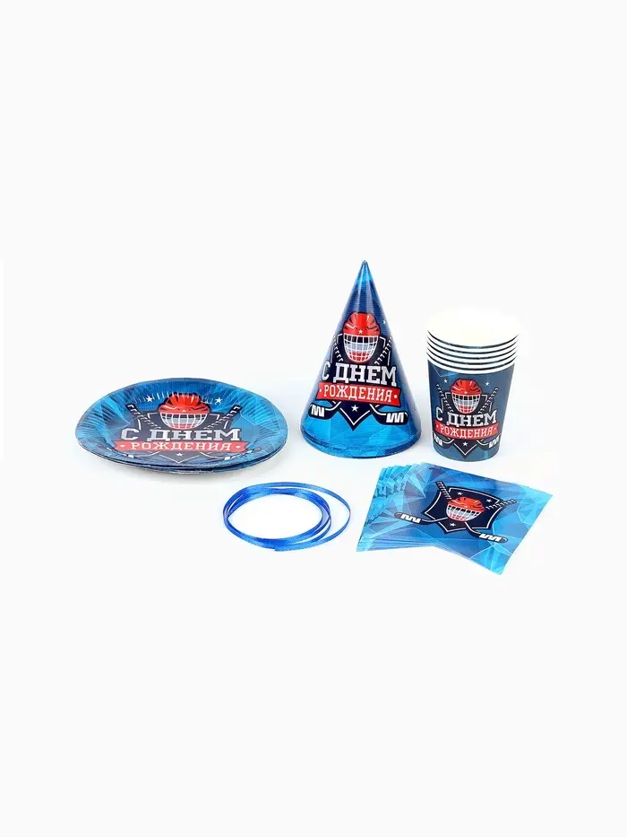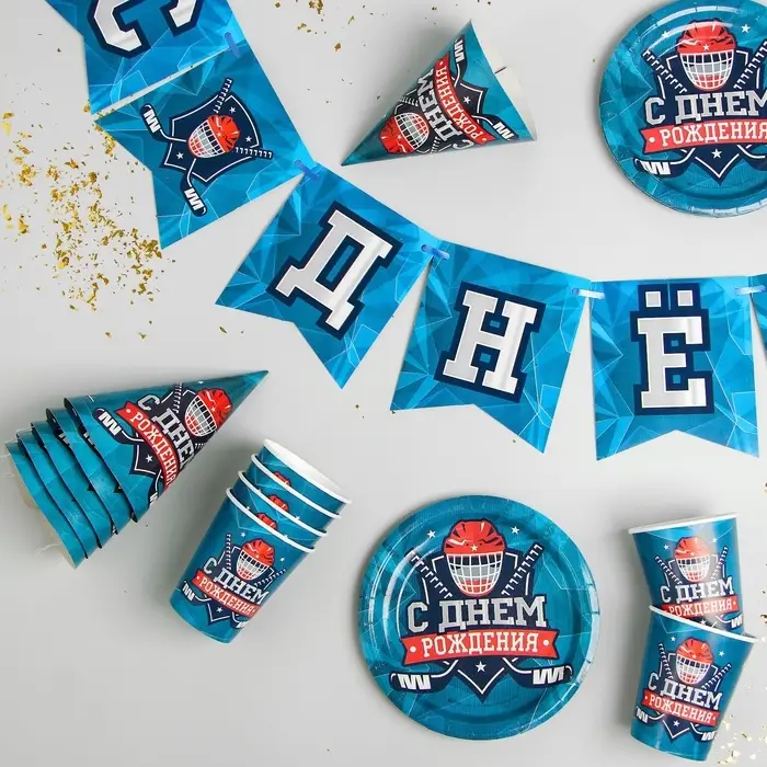 Посуда одноразовая бумажная «С днём рождения. Хоккей», 6 тарелок, 6 стаканов, 6 колпаков, гирлянда