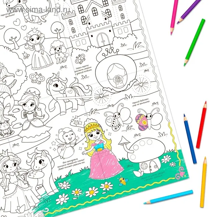 - Плакат большого размера предоставляет обширное поле для раскрашивания, где малышка может экспериментировать с карандашами или акварелью.