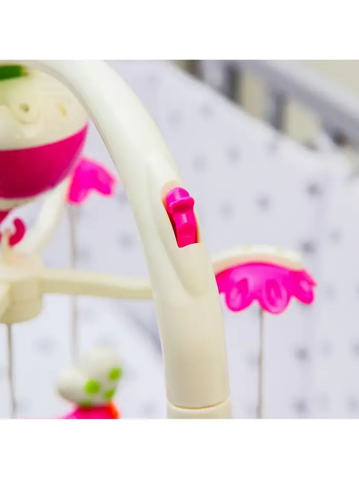 - 5 ярких игрушек над кроваткой медленно крутятся, привлекая внимание ребёнка. Их можно снять и использовать отдельно для игры.