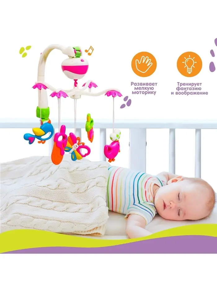 Нежные мелодии для самых маленьких! Музыкальный мобиль «Полянка» создаёт уютную атмосферу в детской. Механизм запускает вращение подвесных игрушек и нежные мелодии, помогая малышу расслабиться перед сном.