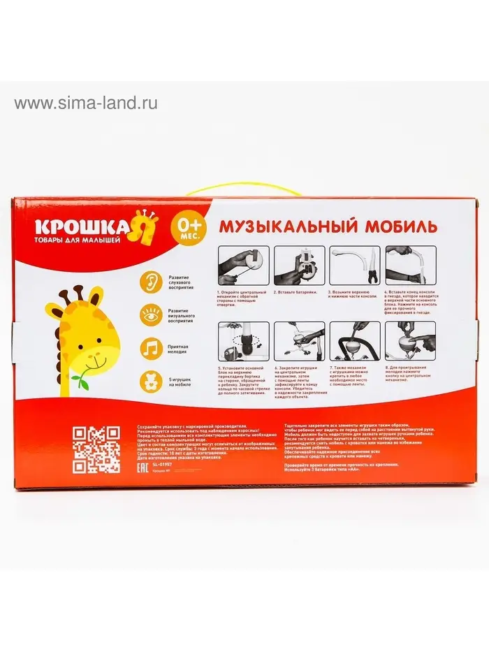 - Музыкальный блок работает от 3 батареек типа АА — мобиль проигрывает 8 мелодий и плавно вращается. Это успокаивает малыша и развивает зрительное восприятие.