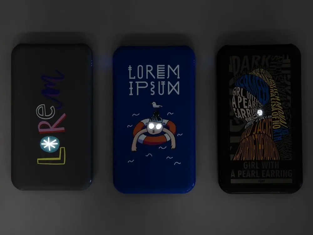 На лицевую поверхность может быть нанесено полноцветное изображение, а гравировка, хотя и будет одноцветной, сопровождается равномерной белой подсветкой. 120 секунд постоянного холодно-белого свечения при начале заряда смартфона, а также при начале и окончании заряда самого аккумулятора (или при нажатии на кнопку).