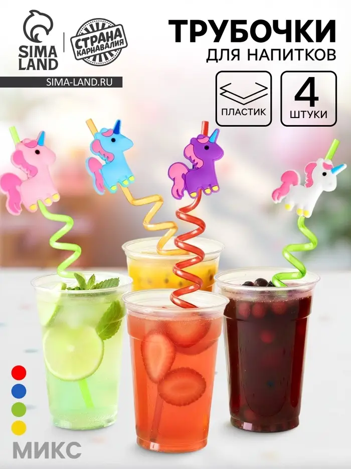 Трубочка из пластика «Единорог», набор 4 шт., МИКС