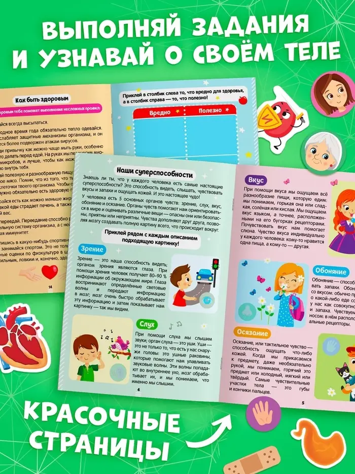 Книга помогает детям в игровой форме изучить основы анатомии. Ребёнок узнает, как работают органы, мышцы и кости, и поймёт, почему тело человека — это настоящее чудо природы. Задания с наклейками развивают мелкую моторику, внимание и любознательность.