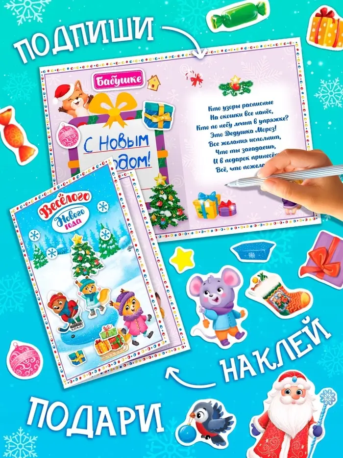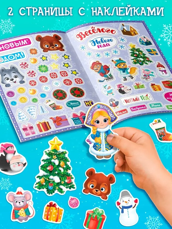 Книжка с наклейками поможет скоротать время в ожидании праздника и смастерить оригинальные открытки для близких.