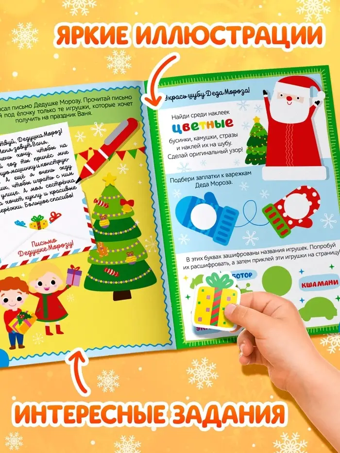 Книга с наклейками разнообразит каникулы малыша и увлечёт в мир весёлых заданий и головоломок. С её помощью ребёнок поможет Дедушке Морозу рассортировать письма от детей и доставить новогодние подарки, а ещё решит занимательные IQ-задачки.