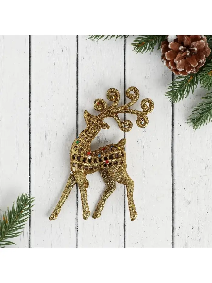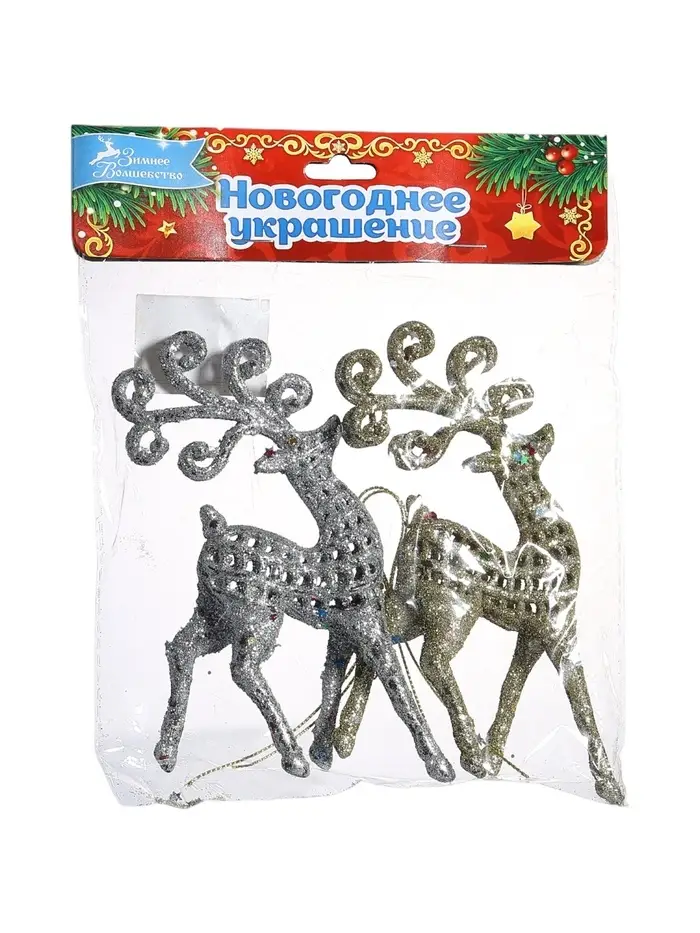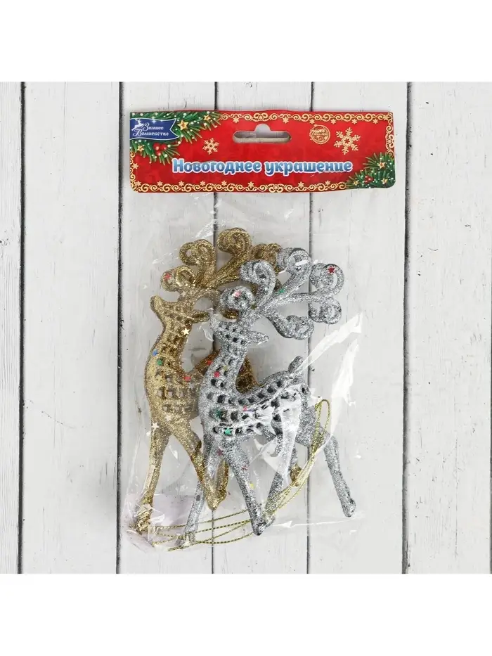 Ёлочные игрушки 2 шт. «Зимнее волшебство. Ажурный олень в блёстках» пластик, 5.5×12 см, серебро/золото