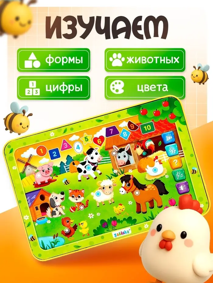 Детский музыкальный планшет «Моя ферма» — это интерактивная игрушка с обучающими функциями. Яркий планшет знакомит ребёнка с животными, цифрами и цветами через песни, потешки и игры. Работает от 3 батареек ААА.