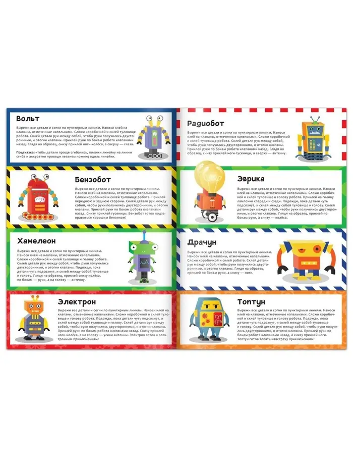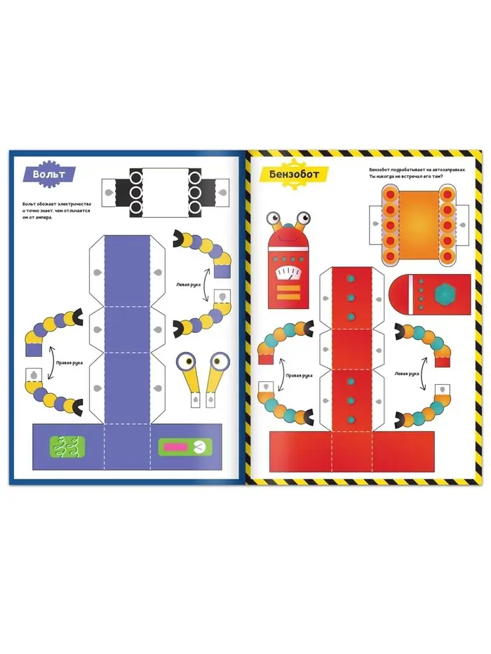 Эта книга напоминает путешествие в будущее, где каждый робот оживает в руках ребёнка. Каждая фигурка собирается поэтапно: вырезание деталей, их склеивание и сборка превращаются в захватывающий процесс. Это похоже на работу инженера, только вместо сложных механизмов — ножницы и клей, а результат всегда радует.