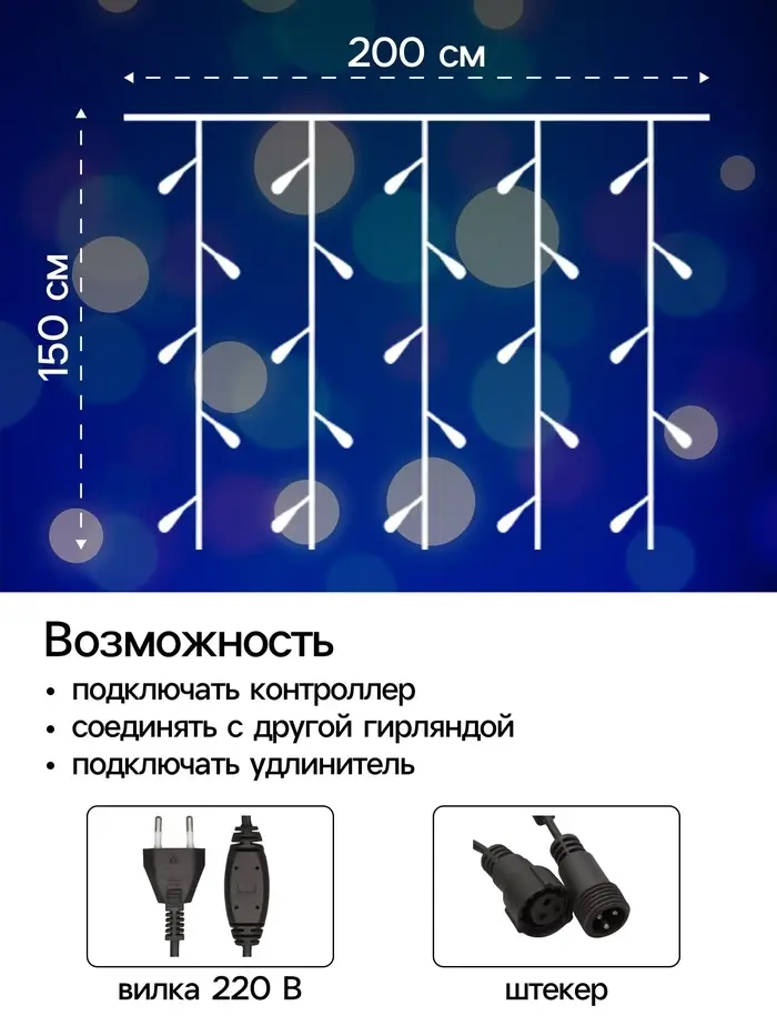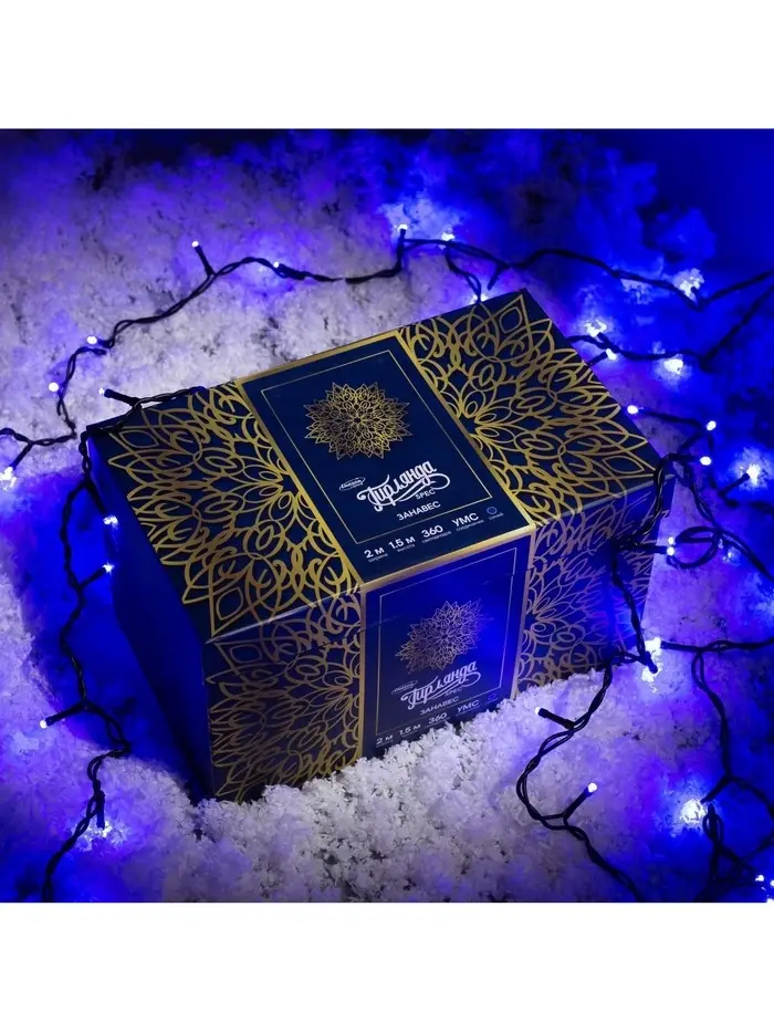 Гирлянда «Занавес» 2×1.5 м, IP44, УМС, тёмная нить, 360 LED, свечение синее, 220 В