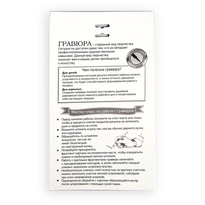 Гравюра представляет собой многослойное панно, покрытое чёрной краской, на которое нанесён контур рисунка. С помощью особого скребка (штихеля), который входит в набор, путём процарапывания и создается гравюра.