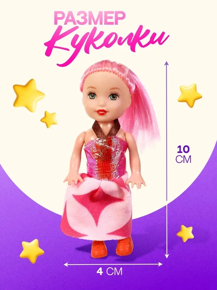 Размер куколки: 4 × 2 × 10 см. Купайте куколку, делайте ей причёски на длинные волосы.