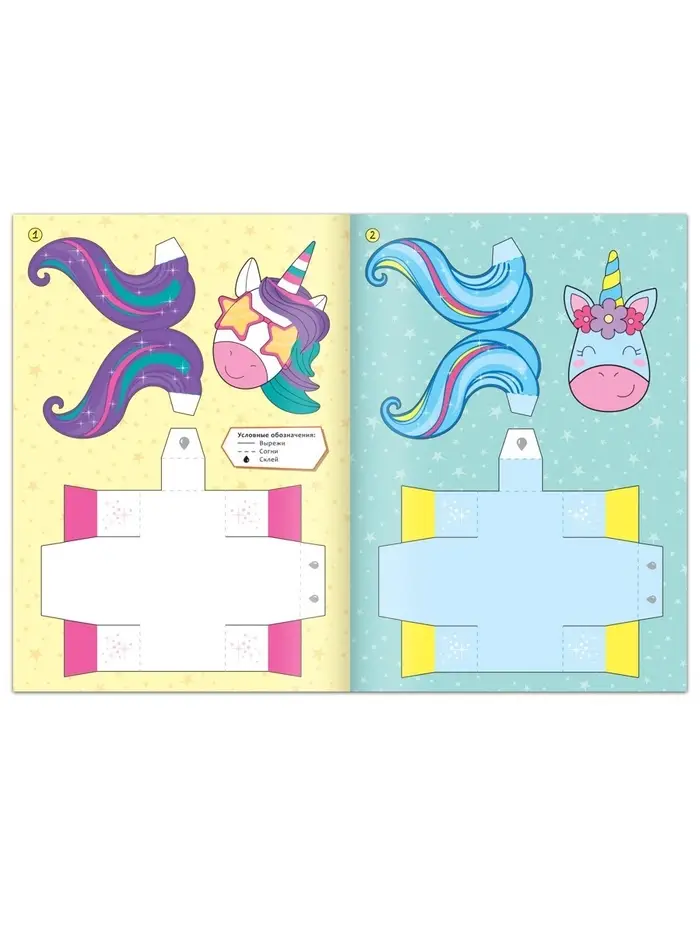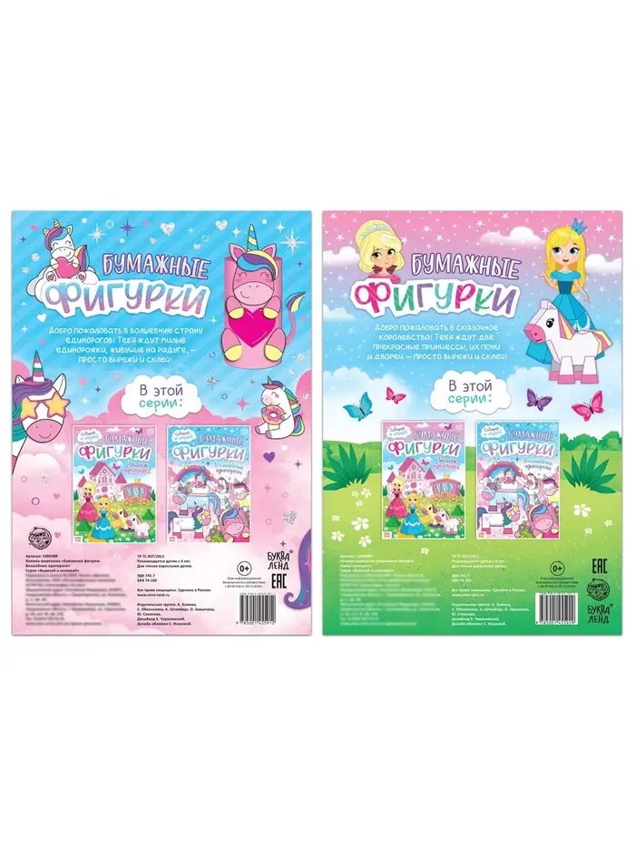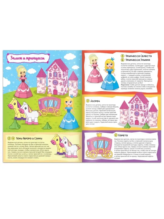 - Каждая книга содержит заготовки для создания фигурок: единорогов, кареты, принцесс и даже целого дворца.