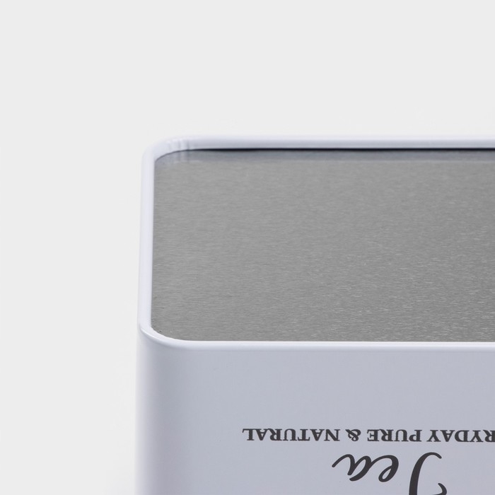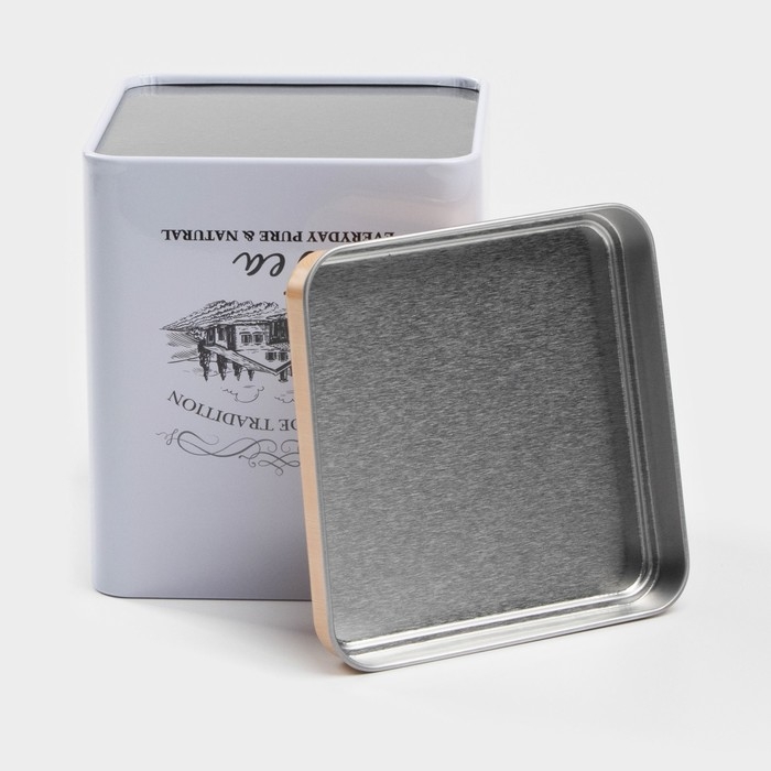 Банка для сыпучих продуктов изготовлена из жести. Крышка плотно закрывается и защищает еду от излишней влаги и проникновения посторонних запахов.