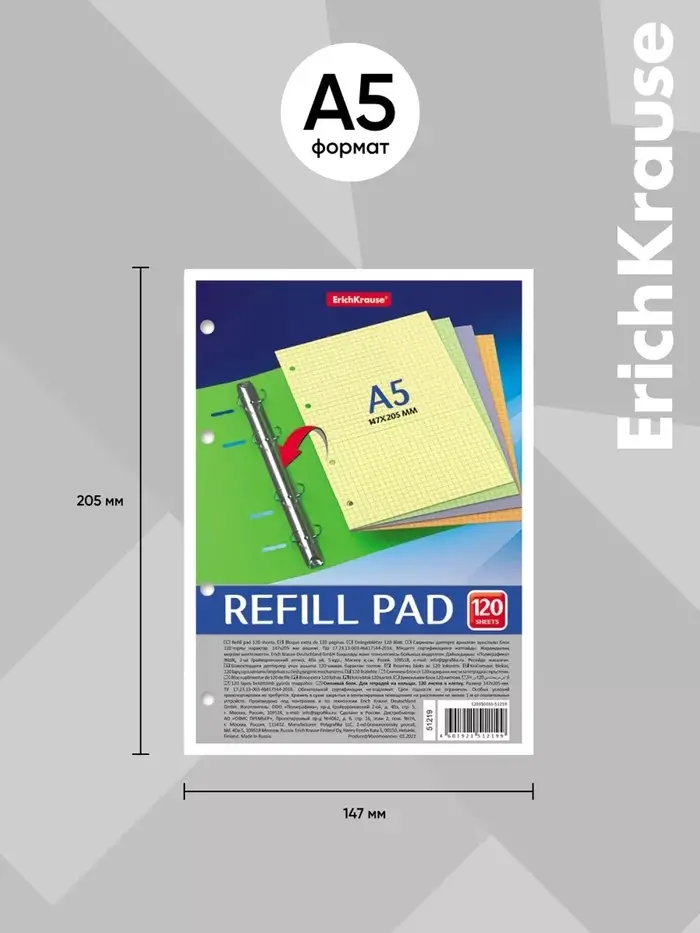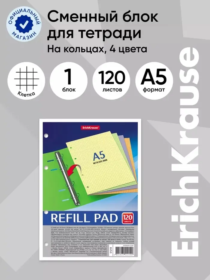 Сменный блок для тетрадей на кольцах формата А5 (147 х 205 мм). Благодаря плотной верхней обложке блок не деформируется. 120 листов в клетку. 4 цвета по 30 листов. Бумага офсетная плотностью 65 г/м2. Цвет линовки - синий. Перфорация под кольца. Имеет индивидуальную упаковку в термоусадочную пленку.