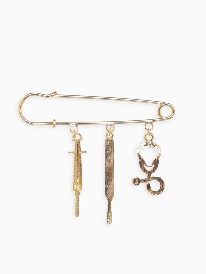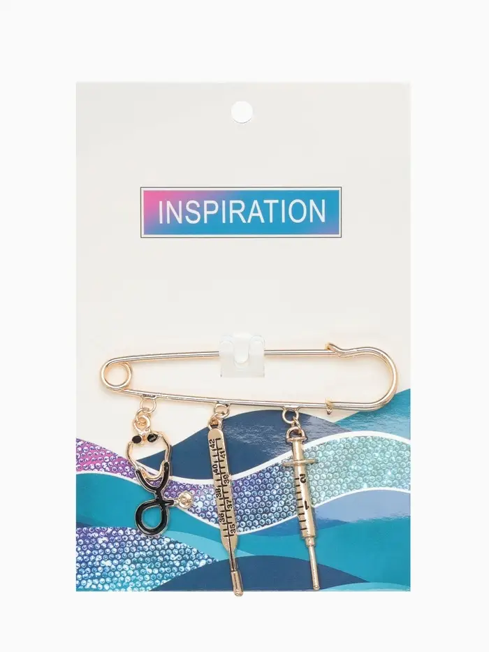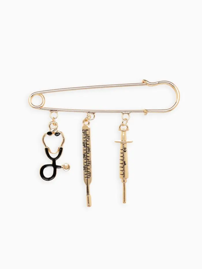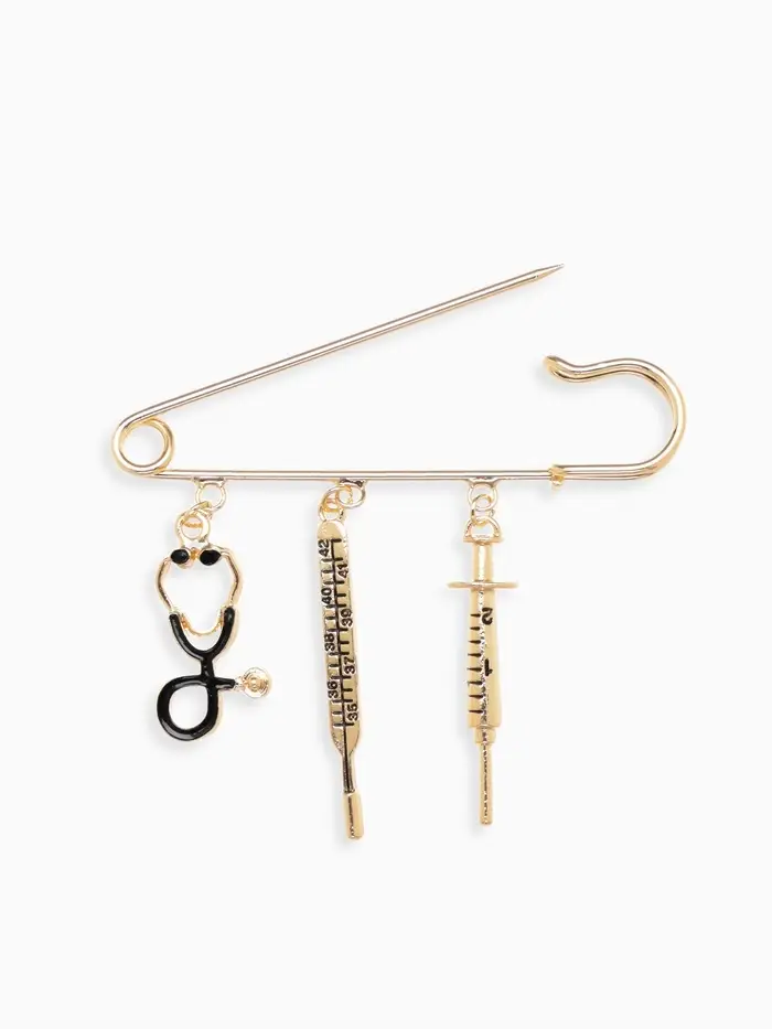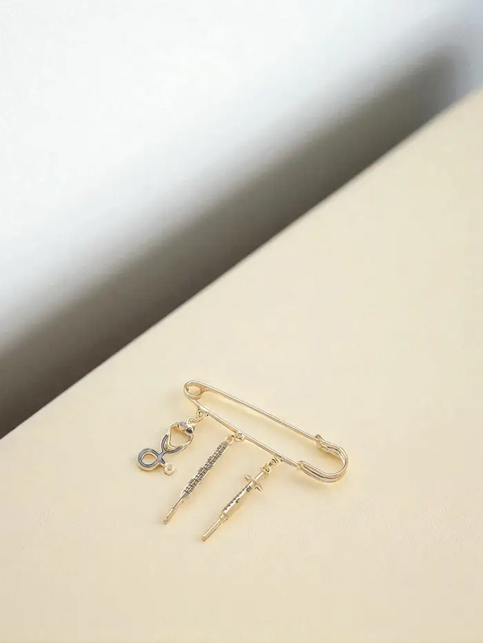 Стильная булавка с подвесками, выполненная в изысканном сочетании чёрного и золотого, станет ярким акцентом в образе медицинского специалиста. Её утончённый дизайн подчёркивает профессионализм и преданность делу, а эмалевые вставки добавляют глубины и выразительности, делая аксессуар одновременно строгим и элегантным.