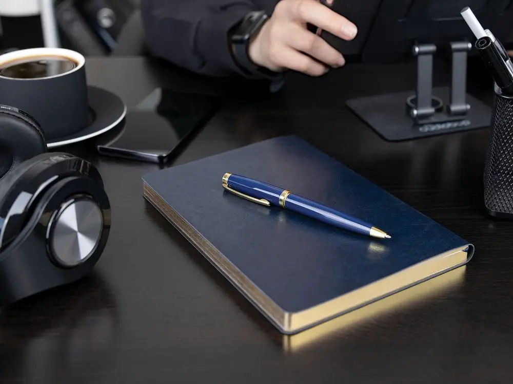 Классическая металлическая ручка с глянцевым корпусом и золотистыми деталями. Идеальный подарок для ценного сотрудника.