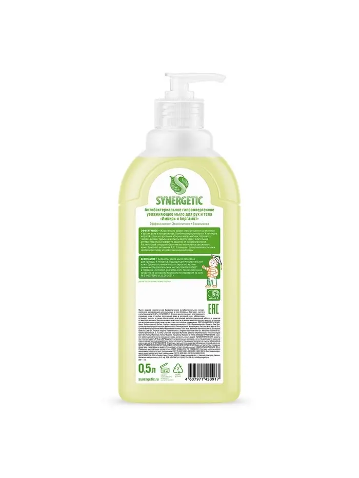 Мыло жидкое Synergetic «Имбирь и бергамот», гипоаллергенное, антибактериальное, 500 мл
