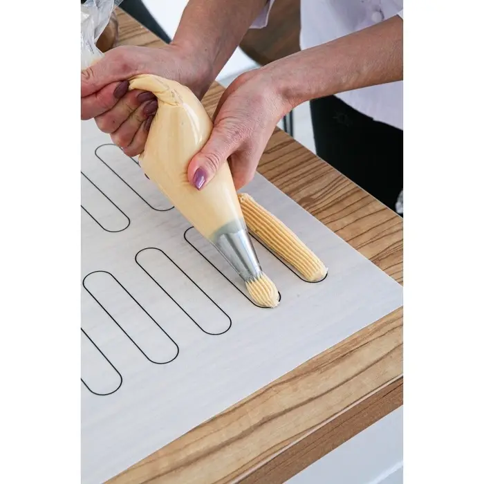 Компактный армированный коврик для выпечки KONFINETTA «Эклер» с разметкой — практичное решение для небольших кухонь и точной кондитерской работы. Толщина 0,4 мм обеспечивает плотное прилегание к поверхности без образования складок и перепадов высоты. Внутренний слой из стекловолокна гарантирует стабильность формы при раскатке даже самого крутого теста. Контрастная разметка на силиконе помогает выдерживать единый размер заготовок для миниатюрной выпечки, конфет и десертов.