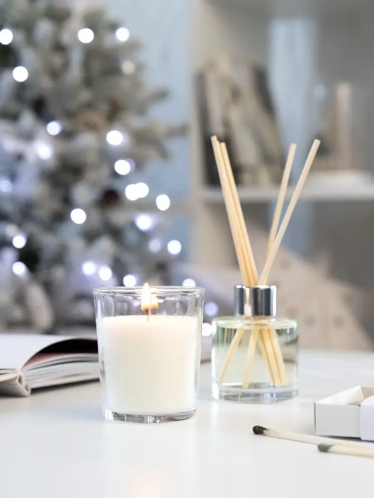 флакон - стекло; палочки - дерево; свеча - парафин, стекло