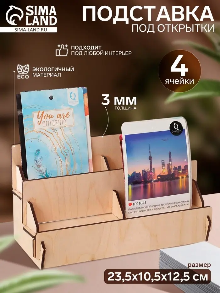 Подставка под открытки 4 ячейки по 10.8 см, 23.5×10.5×12.5 см, толщина 3 мм, бежевая